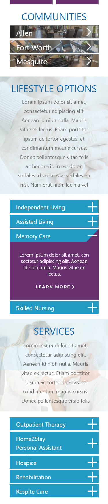 As I was tasked with developing the mobile design, I reduced scrolling length by turning the information boxes utilized in the desktop design by our lead designer into simple accordion sections, rather than stacking the boxes. I also made the homepage location links shorter with an arrow designating it will lead users to a new page.