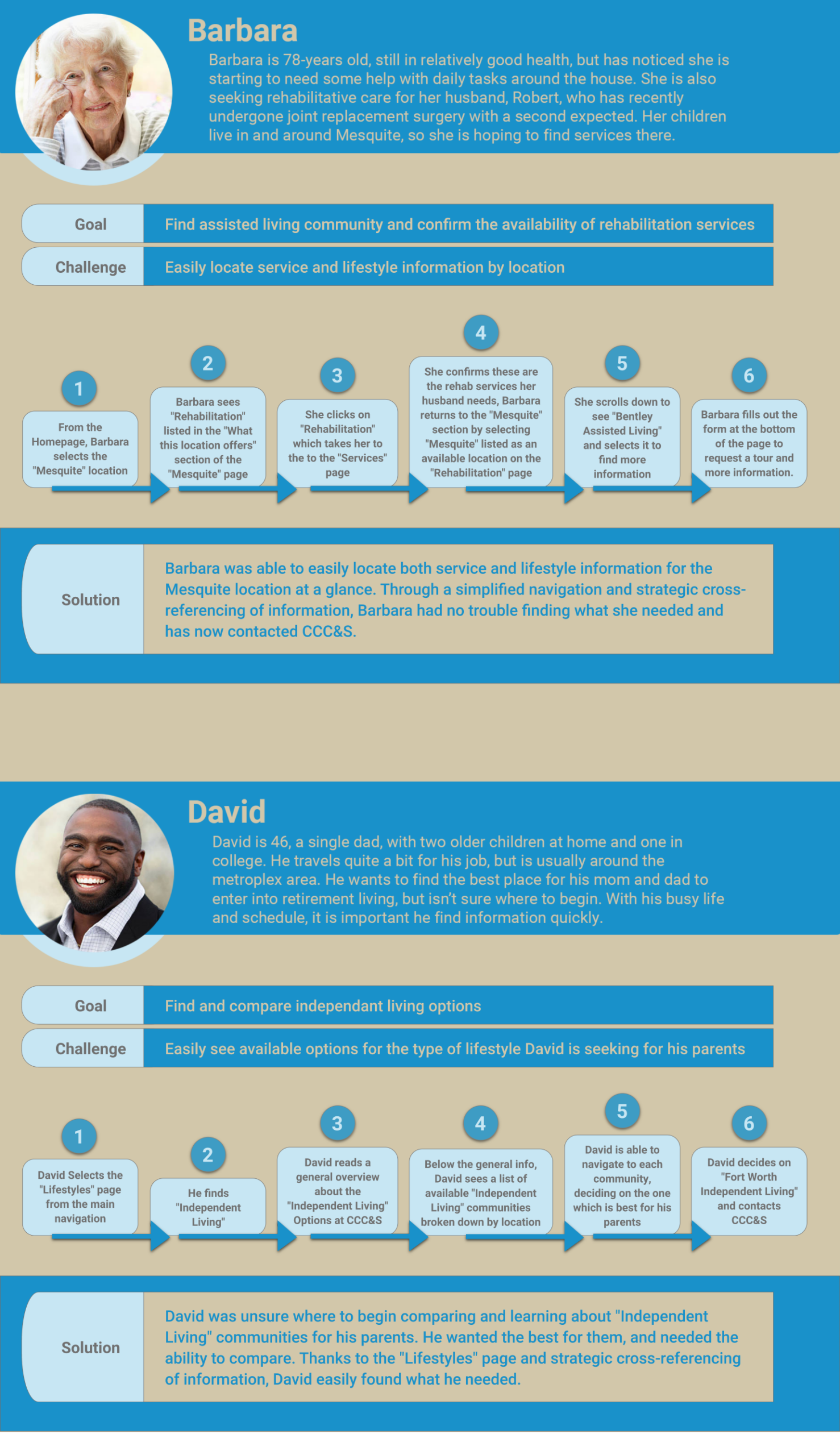 I created two final user profiles and journeys showcasing how the new IA, navigation, and page structure would better meet the needs of community members and their families.