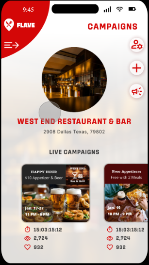 • Create a “Flave Feed” and a map that can be used by all Flave Users to see when local restaurants are running new campaigns